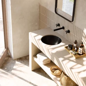 Steht frei auf der Waschtischplatte und wird durch die sichtbare Form zum Designobjekt.